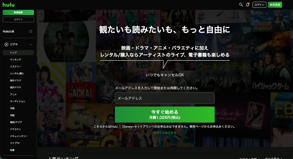 Disney+とのセットプランも要チェック。 Hulu単体(1,026円)とDisney+スタンダード単体(990円)を別々に契約すると合計2,016円ですが、セットプランなら月額1,490円で両方使えます。毎月526円お得になる計算です。