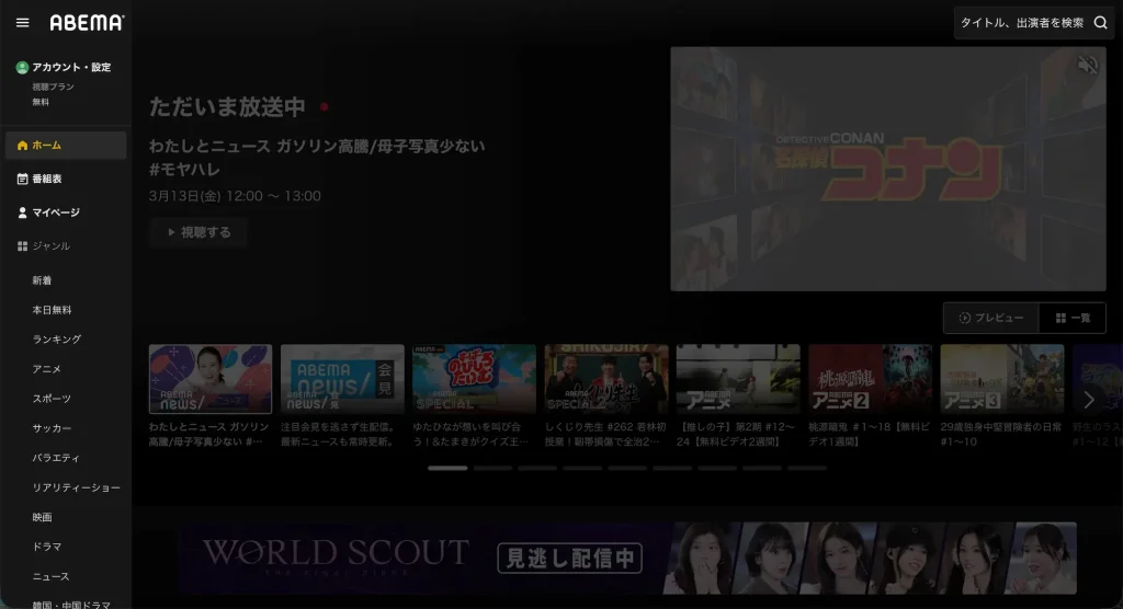 ABEMAの最大の特徴は、無料でも一部のコンテンツが視聴できること。