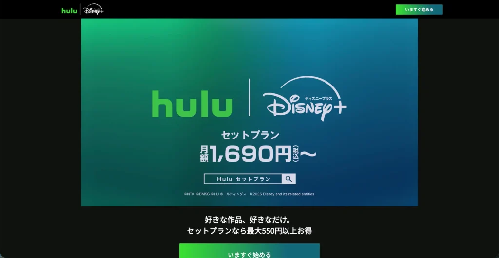 - ディズニー作品も欲しい → Hulu | Disney+セットプラン(単体より毎月476円お得・5月値上げ前がチャンス)